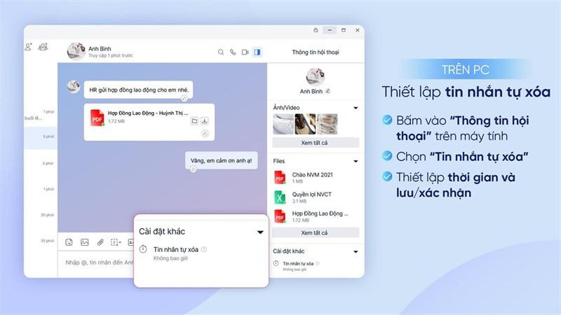 Để thiết lập tính năng mới này trên PC, các bạn cần bấm vào "Thông tin hội thoại" sau đó chọn "Tin nhắn tự xóa" và cuối cùng là thiết lập thời gian/ xác nhận.